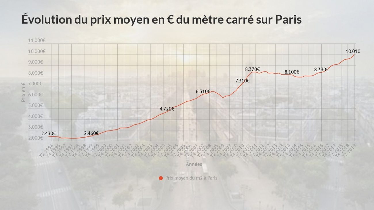 Selon nos informations, au premier trimestre 2019, le prix moyen du mètre carré à paris dépasse les 10.000 euros dans l'ancien d'après le réseau century21. Mise à jour août 2021. En moins de 10 ans les prix immobiliers à paris ont progressé de plus de 50%. Ce tarif pour un m2 de surface habitable en ville est plus important que le prix pratiqué en moyenne en france (de 111%). En période de forte inflation et de taux d'intérêt élevé, le prix du mètre carré à paris n'augmente que très légèrement.cela signifie que les prix baissent en euros constants.